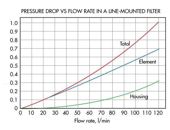 該圖標闡述了過濾器的特性,其被設計用于即使在很高的流量時也具有低壓差-總壓差是濾芯壓差與濾殼壓差之和,并且主要由濾芯壓差決定。