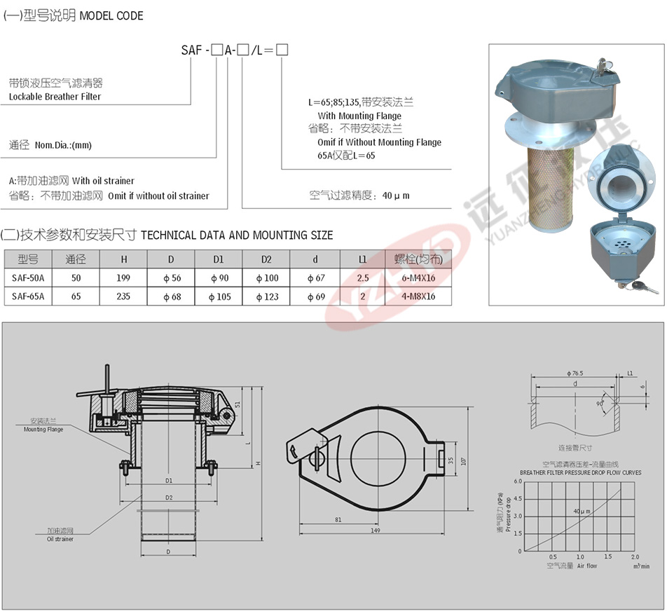 SAF系列帶鎖液壓空氣濾清器帶鎖,保證了客戶的安全使用,加油濾網可以有效的濾除加油過程中的大顆粒污染物,安裝方便等優點。